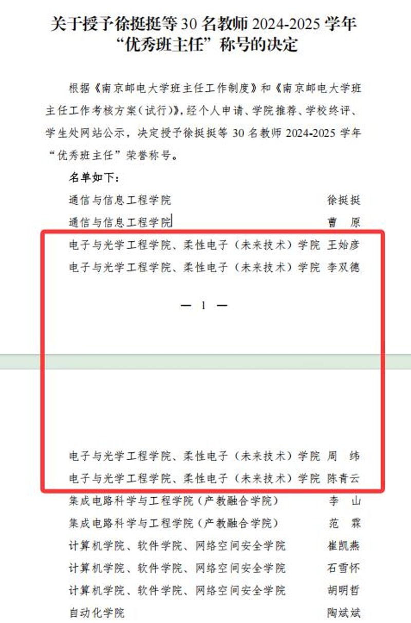 近日,南京郵電大學2024-2025學年“優秀班主任”評選結果正式揭曉。全校共30位教師獲此殊榮,其中,電子與光學工程學院、柔性電子(未來技術)學院共有四位教師光榮入選,分別是王始彥、李雙德、周緯、陳青云。本次評選注重學生的真實反饋,根據“學生評價情況”(即班主任工作測評分數)和班主任提交的各類履職材料,對各位班主任老師的履職情況進行綜合評定,最終擇優入選。電光柔院此次能夠有四位教師脫穎而出,榮獲校級“優秀班主任”稱號,是學校對學院班主任工作整體水平和育人實效的高度認可。入選老師在日常工作中,始終堅守育人初心,恪盡職守,在思想引領、學業指導、生涯規劃、班級管理等方面傾注了大量心力,贏得了學生一致好評。此次優異成績的取得是學院長期以來堅持立德樹人根本任務、不斷加強和改進班主任工作的成果體現。電光柔院將以此為契機,持續深化班主任隊伍建設,充分發揮優秀班主任的示范引領作用,不斷探索學生工作的新思路、新方法,努力提升人才培養質量,為學生的全面成長成才和學校的高質量發展做出更大貢獻。撰稿:祝騰審核:徐磊編輯:祝騰